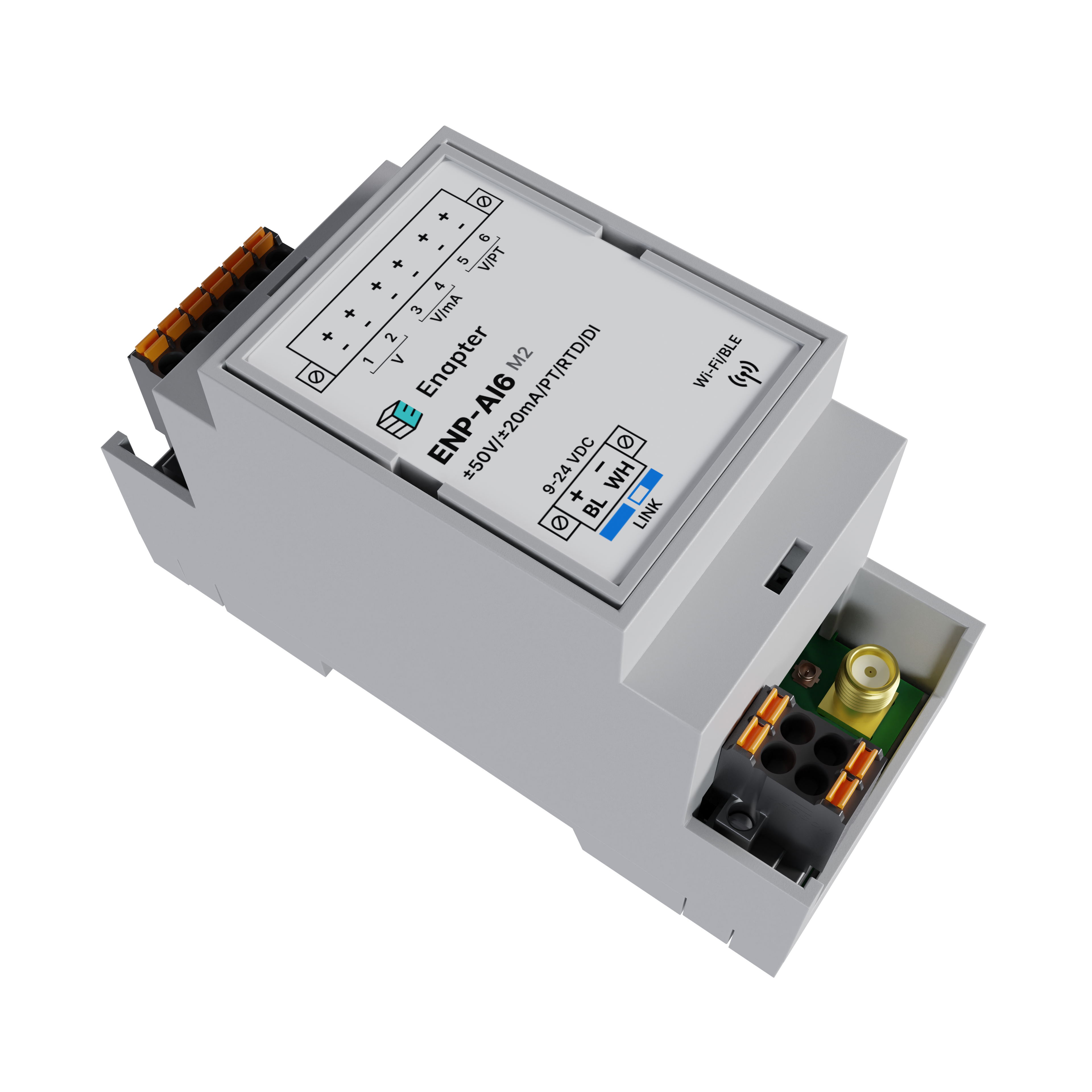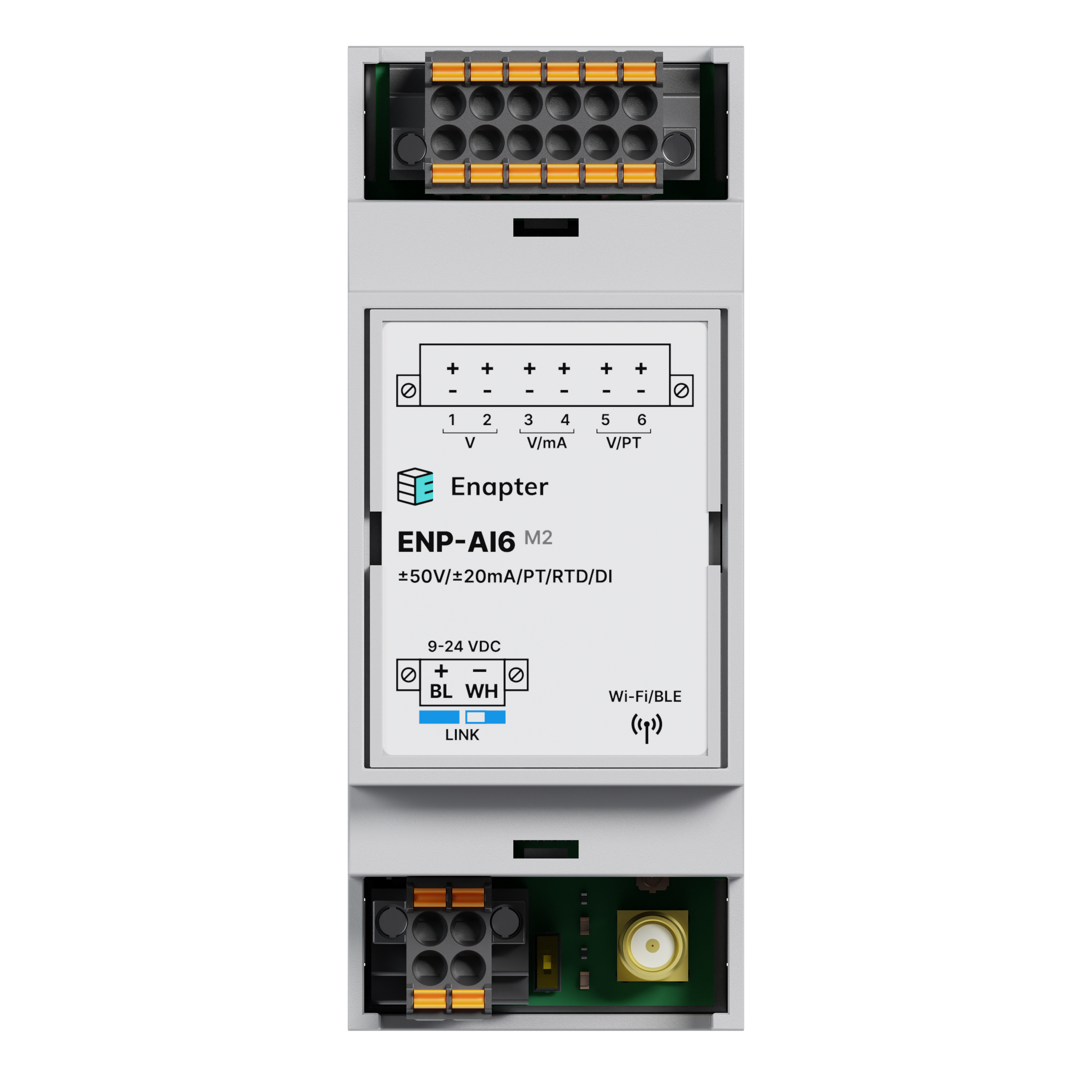 The ENP-AI6 M2 module features a wired bus interface based on the Enapter Link protocol, enabling multiple modules to be linked and ensures reliable communication and seamless integration with top-level systems, such as the Enapter Gateway. It also includes wireless Wi-Fi capabilities for secure data transmission and control via the Enapter Gateway and/or Enapter Cloud.