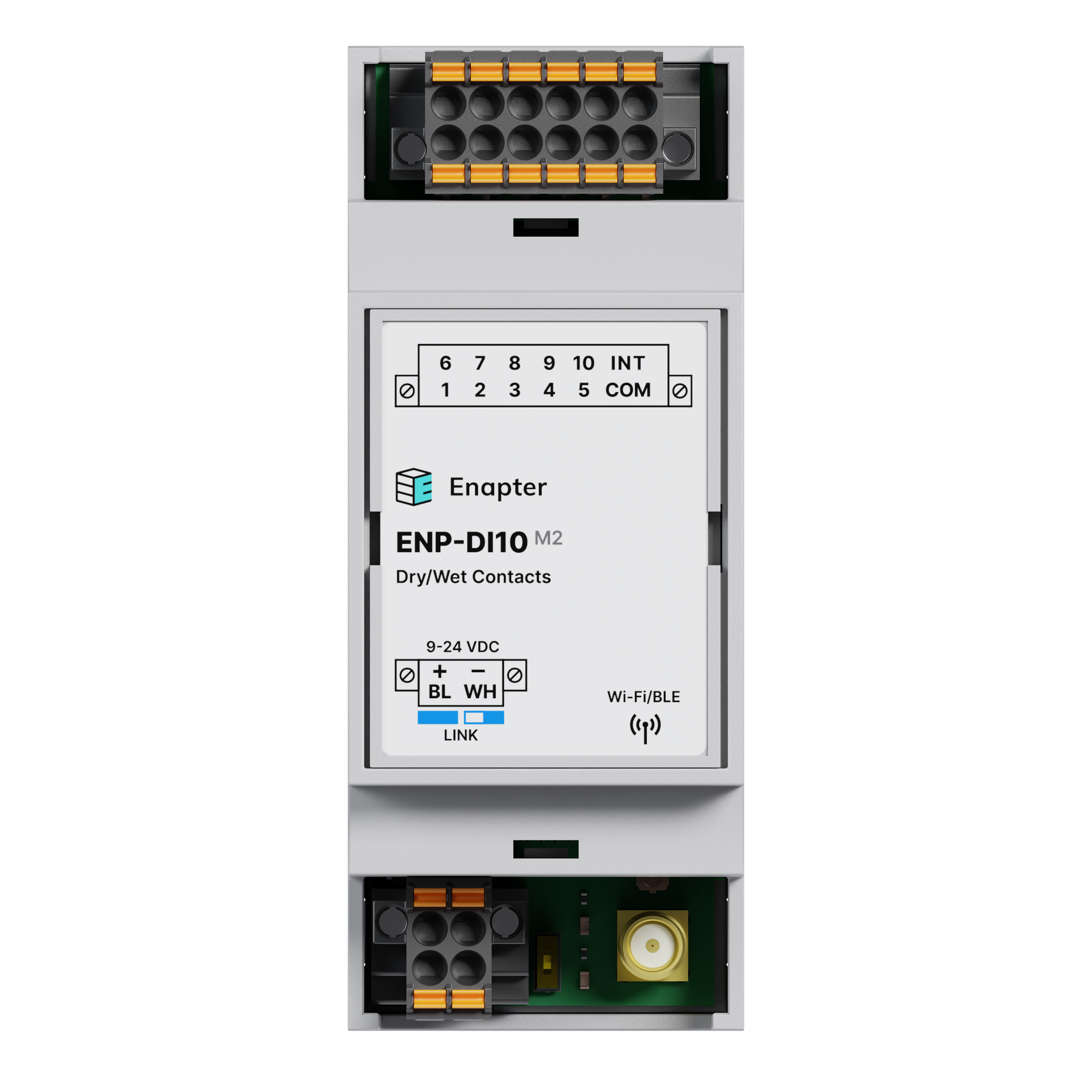 The ENP-DI10 M2 module features a wired bus interface based on the Enapter Link protocol, enabling reliable communication with other modules. It also includes wireless Wi-Fi capabilities for secure data transmission and control via the Enapter Gateway and Enapter Cloud.